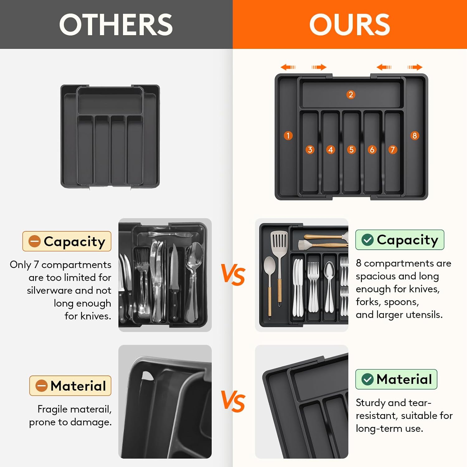 - Sort Your Silverware: With 3 different size options and a total of 8 compartments for easy sorting and storage, this kitchen drawer organizer allows you to easily recognize, identify and pick up the items you need for use.